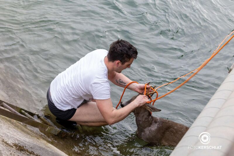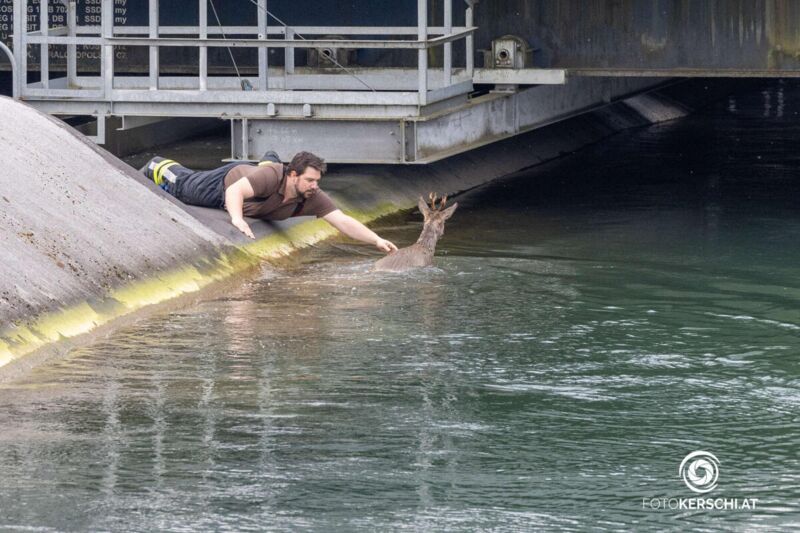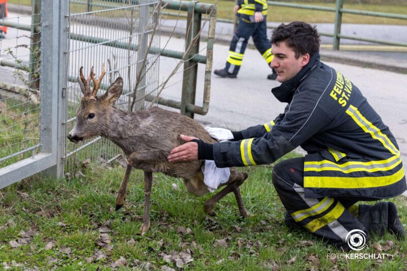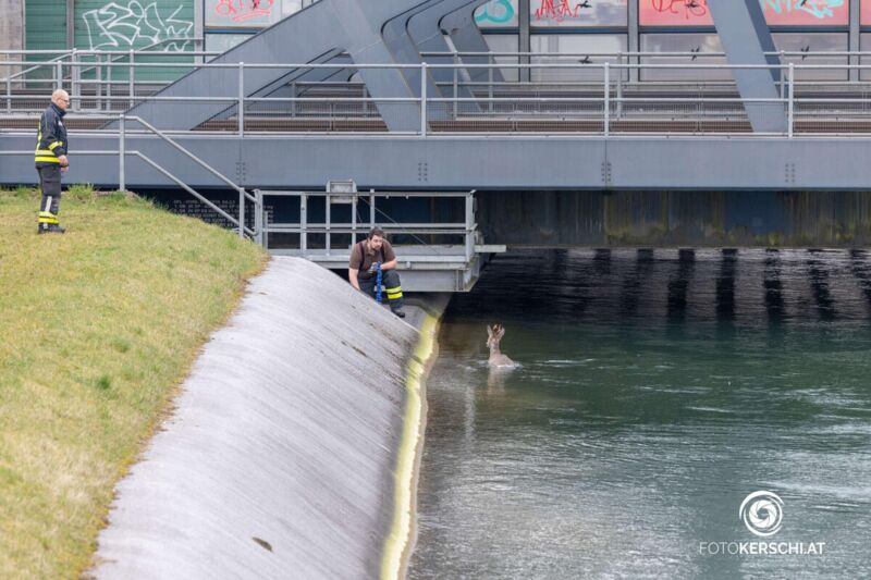 ST. VALENTIN. Am Freitagmorgen rettete die Feuerwehr der Stadt St. Valentin einen Rehbock, der in den Ennskanal gestürzt war.