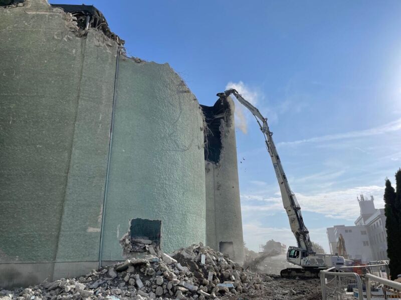 #wirhabendenlängsten – mit diesem Hashtag wirbt die Firma Zöchling am Ausleger des Liebherr 960. Der gigantische weiße Abbruchbagger zählt zu den größten Abbruchmaschinen der Welt und ist aktuell in Enns im Einsatz. 36,5 Meter beträgt die Reichweite des Baggers – genug, um auch die Oberkante der Silos zu erreichen und Stück für Stück abzuknabbern. Bereits im Winter begann man, die Silos von innen her auszuhöhlen, aktuell ist der Abriss der Außenschale im Gange. Die Firma Hasenöhrl ist für den Abbruch zuständig und hat den riesigen Bagger von der Firma Zöchling angemietet. Der „weiße Riese“ knabbert nun die über 30 Meter hohen Silos bis auf eine Höhe von 20 Metern ab. Danach übernimmt ein kleinerer Bagger den weiteren Abriss.