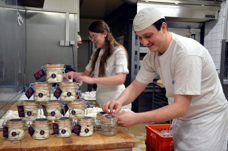 „Love Keks“ sind das diesjährige regionale Produkt aus St. Valentin, das zum Valentinstag in ausgewählten Geschäften St. Valentins verkauft wird. Die Vorgabe des Stadtmarketings lautete, es müsse ein Produkt sein, das im Rexglas verpackt wird. Nach Experimenten mit Kuchen im Glas kam Seniorchefin Gabi Schneller auf die Idee, Mostkekse zu empfehlen. Das ist ein traditionelles und köstliches Gebäck, das zu Unrecht in Vergessenheit geraten, in Altenhofen aber noch bekannt ist. Die ersten Backbleche sind schon fertig und Martina Kaufmann und Johannes Schneller haben sichtlich Freude beim Verpacken. Immerhin gibt es insgesamt bereits 180 Vorbestellungen. An die 2.000 Kekse sind schon gebacken. Und man kann schon ahnen: Die Kekse werden weggehen wie die warmen Semmeln.