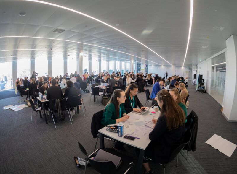 Anschließend musste in 40 Minuten für das zuvor ausgearbeitete Konzept ein Business- und Investmentplan inklusive Powerpoint-Präsentation und Pitch vorbereitet werden. Das Team „VIEknow“ nahm die letzte Konzentration zusammen und setzte sich mit den Zahlen und Fakten auseinander. Auf der großen Bühne mussten diesmal fünf Investoren sowie das Publikum, bestehend aus Teilnehmern und Business Jury Mitgliedern, von der Idee überzeugt werden. „Wir hatten das Gefühl, bei der Show ‚Höhle der Löwen‘ zu sein“, kommentierte das Team den Auftritt danach.