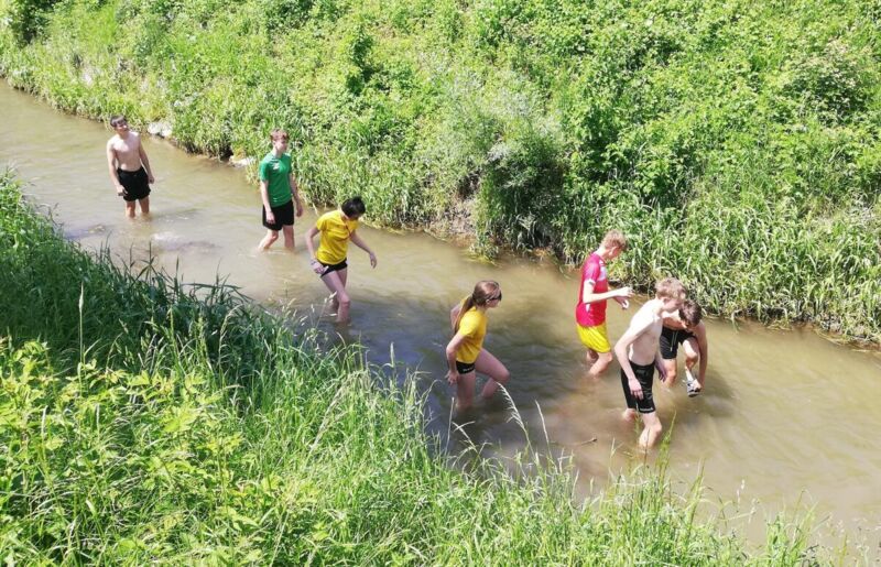 Das schöne und warme Wetter und das nahende Schulende ermöglichten es den Schülerinnen und Schülern der 4a, diese Runde einmal „schwimmend“ statt laufend zu genießen. Nach anfänglichem Abtasten, ob der doch ziemlich niedrigen Wassertemperaturen, entschieden sich viele für ein Vollbad im kühlen Bach.