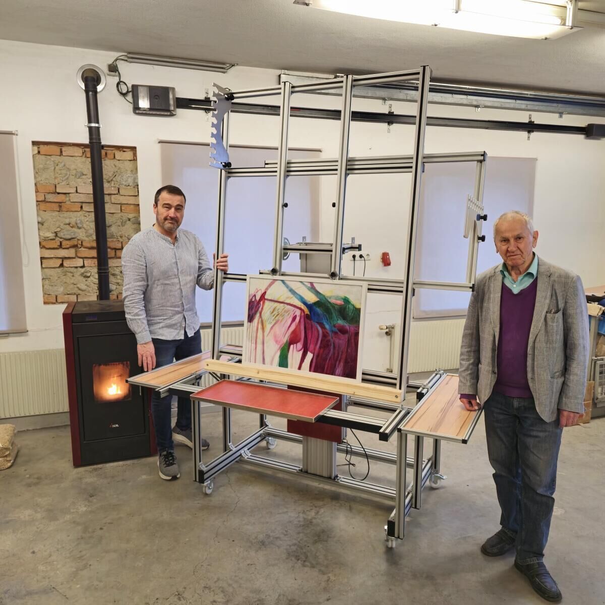 Karl Bunzenberger beschäftigt sich seit einigen Jahren mit der Porträtmalerei. Er suchte eine Atelierstaffelei, die robust ist und keine Wünsche offen lässt. Da eine nach seinen Vorstellungen nicht am Markt war, begann er selbst eine zu planen. Gemeinsam mit David Gansterer von der Firma Technoco Laser und seinem Team, konnte dann ein Prototyp einer multifunktionalen Atelierstaffelei angefertigt werden.