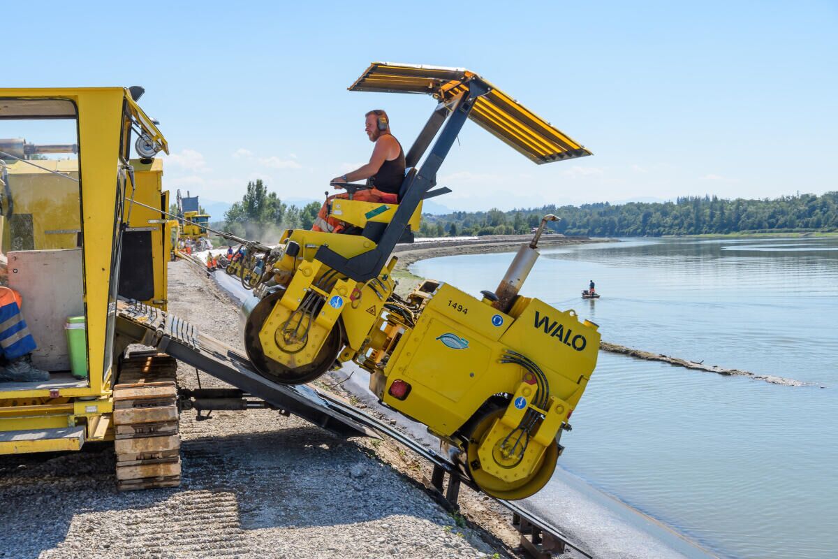 Für diese Arbeiten sind Spezialgeräte notwendig, die die Schweizer Firma WALO extra umbauen ließ. Die Arbeitsmaschinen werden von einem Raupenfahrzeug, das auf der Dammkrone fährt, am Seil gehalten.