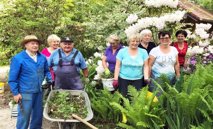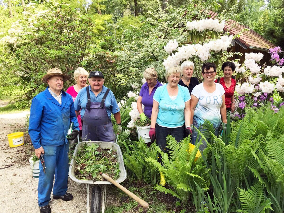 Die Arbeit vieler Ehrenamtlicher, die Bäume, Sträucher und Stauden nachpflanzen und betreuen, ist eine weitere Besonderheit des Gartens, der jederzeit kostenlos zu besichtigen ist. Bis zu 50 Freiwillige haben zuerst mit Josef Pachinger und in den vergangenen zehn Jahren mit Johann Diewald den Garten zu einer Landschaft gemacht, die die Naturliebhaber begeistert. Ende Mai gab es einen Großeinsatz im Botanischen Garten, den der Siedlerverein koordinierte. Neben vielen Privatpersonen arbeiteten der Pensionistenverein, die Naturfreunde, die Kleintierzüchter und der Imkerverein, die ihre Beete und den Imkerlehrpfad auch während des Jahres pflegen. Als Dank lud Bürgermeister Johann Baumann die freiwilligen Helfer zu Frankenburger Bratknödeln zum Wirt z“Dorf ein.