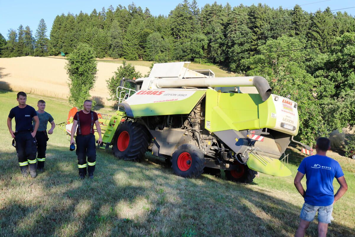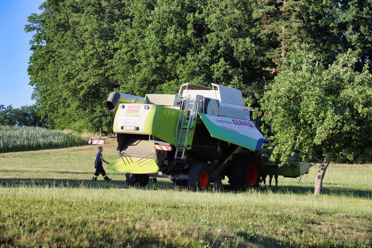 Bei Feldarbeiten mit einem Mähdrescher kam es auf einem Feld zu einem einem Brand. Der Landwirt reagierte blitzartig und konnte das Feuer rasch selbst ablöschen, ehe die alarmierten Feuerwehren an der Einsatzstelle eintrafen. Nachdem der betroffene Bereich kontrolliert wurde, war der Einsatz nach gut einer Stunde wieder beendet.