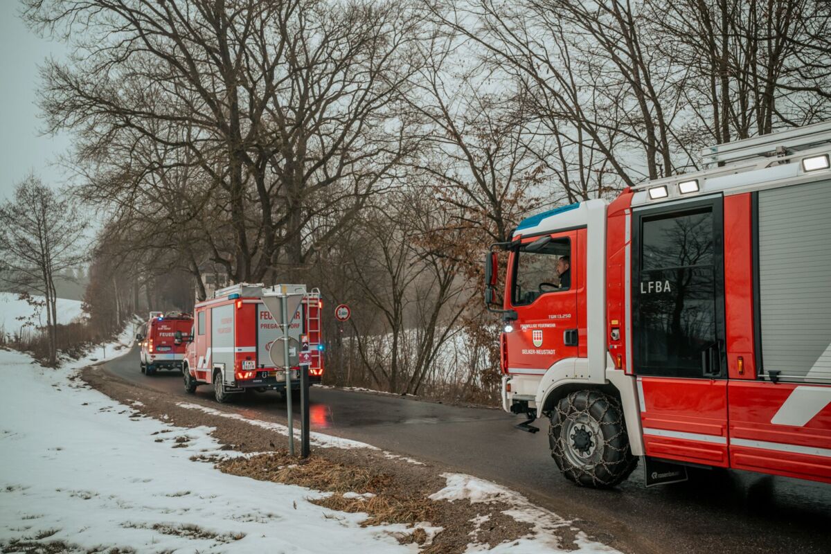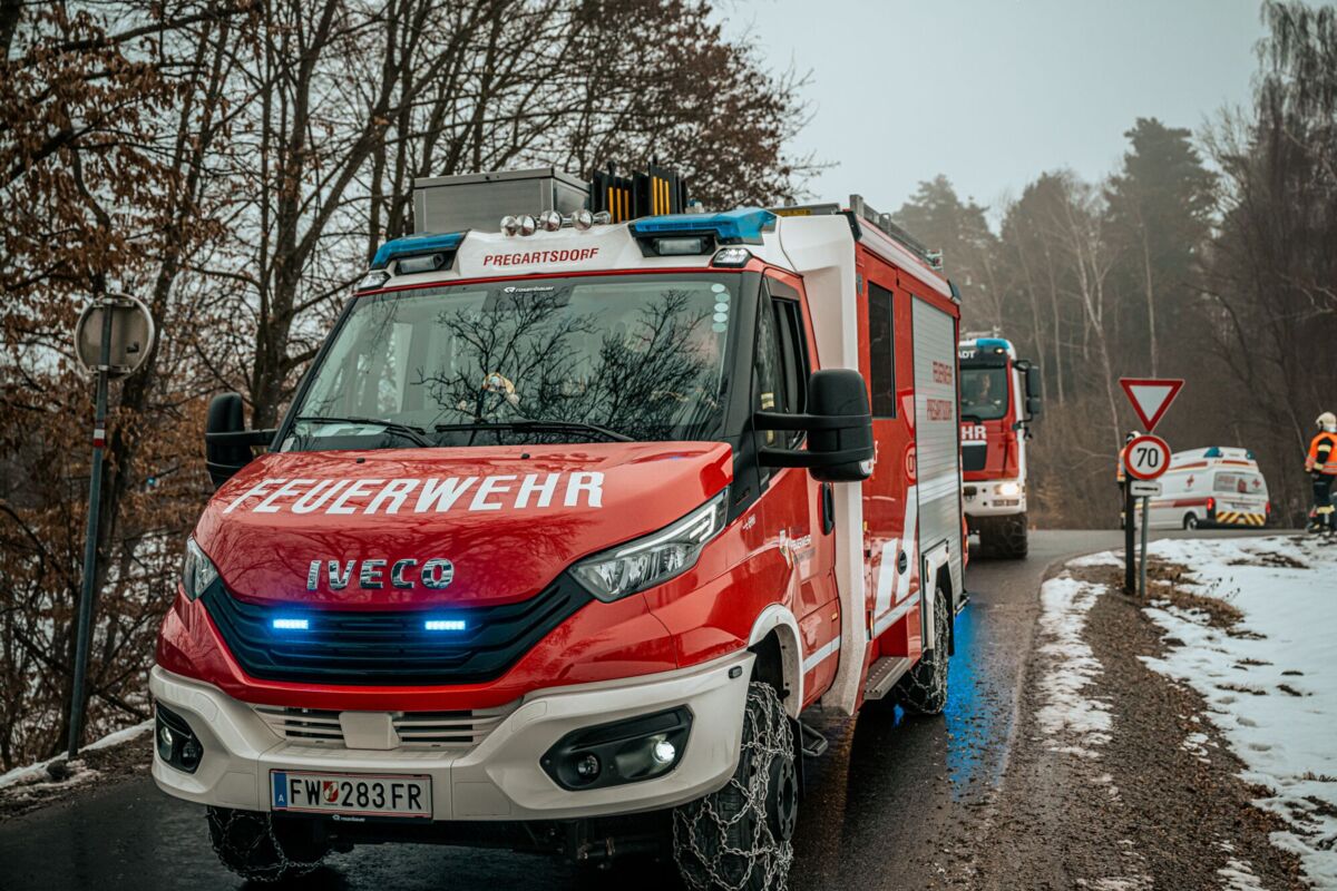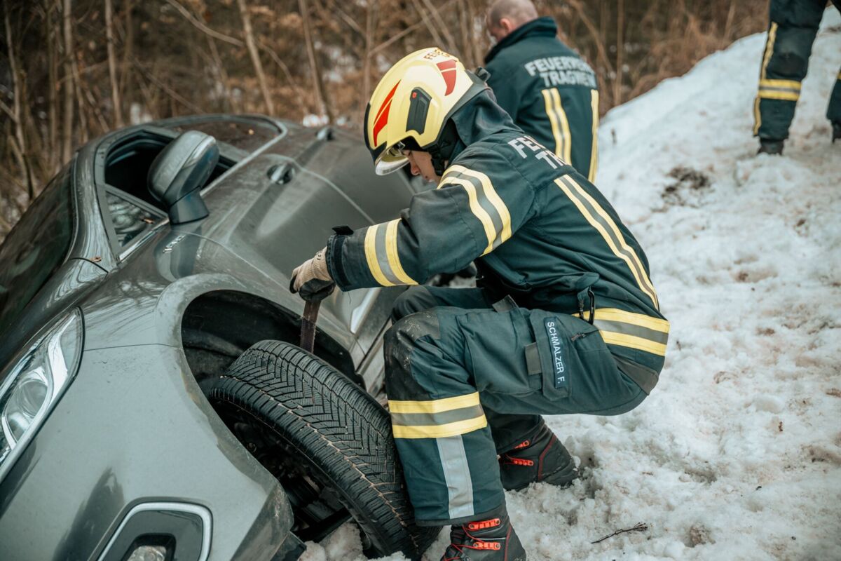 PREGARTEN. Ein Pkw ist am Sonntagmorgen auf spiegelglatter Fahrbahn von der L1472 Gutauer Straße abgekommen. Mehrere Feuerwehren führen die Bergung durch.