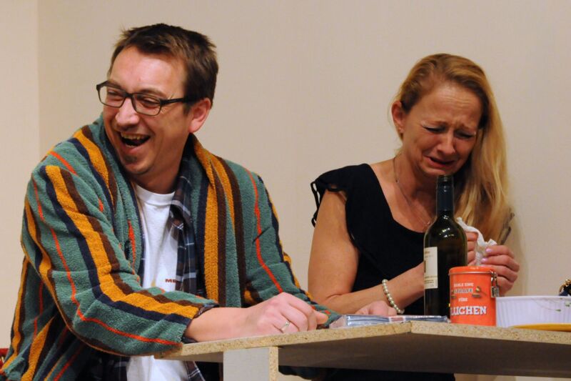 Skurrile Charaktere, Sprachwitz und gutes Timing sorgten für einen unterhaltsamen Abend. Florian Janko (originell) begeisterte das Publikum in der Rolle des tollpatschigen und chaotischen Pantoffelhelden George, der mit seiner Frau keine zweite Hochzeitsreise machen will. Mildred, seine resolute und energische Frau (überzeugend gespielt von Violetta Griendl), beschließt mit ihrer Schwester Bonnie die Reise anzutreten. Aber auch Bonnie (eindrucksvoll gespielt von Karin Schinagl) und ihr Ehemann Humphrey (Mario Ruschak: ausdrucksvoll) haben Eheprobleme: Humphrey betrügt seine Frau mit seiner Sekretärin. Die beiden Männer, nun alleine zuhause, verbringen den Abend mit Humphreys Sekretärin und ihrer Freundin. Die Geschichte spitzt sich zu.