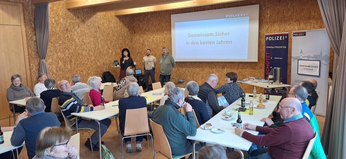 Im großen Saal des Green Belt Centers folgten die zahlreichen Teilnehmer den Ausführungen von Kontrollinspektor Rainer Gattringer und Revierinspektor Dominik Birklbauer von der Polizeidienststelle Freistadt, die auf Gefahren und Betrügereien aufmerksam machten. Dabei gaben sie Tipps zur Sicherung von Wohnung und Haus, zum Erkennen von Betrug - vor allem in den sozialen Netzen - und richtiges Verhalten beim Einkauf. Auch der bekannte „Enkel-Trick“ wurde thematisiert und wichtige Fragen beantwortet.