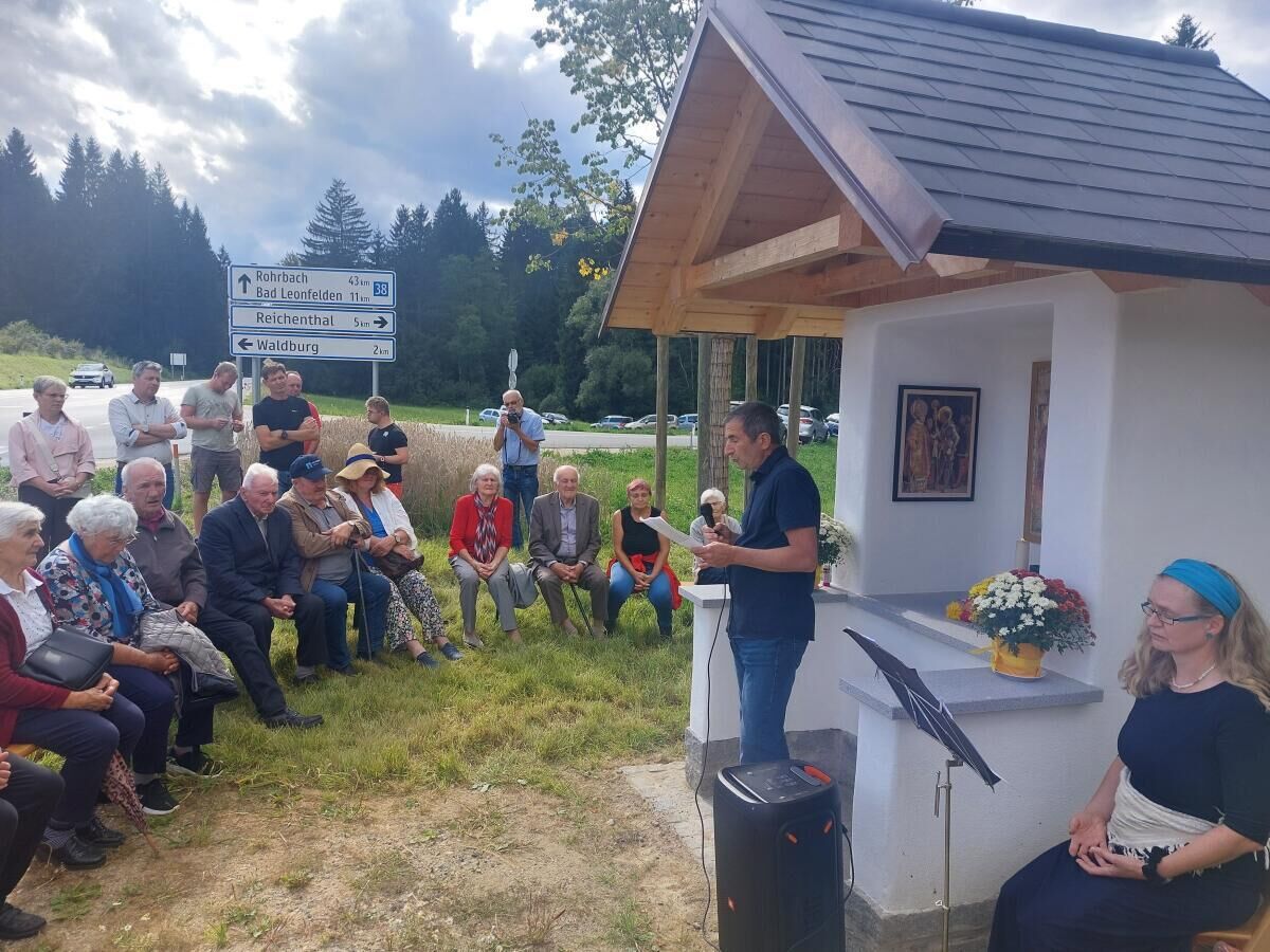 Gottfried Stimmeder und seine Familie luden Freunde, Bekannte, Verwandte und Nachbarn zur Feierstunde ein. Bürgermeister Josef Eilmsteiner und Vertreter der Straßenmeisterei waren ebenfalls dabei. Stimmeder bedankte sich bei der Berufsschule Freistadt für die Bauarbeiten und ging auf den Ursprung und die Sinnhaftigkeit dieser Bauwerke ein. Sabine Mayr erklärte die Bedeutung und geschichtlichen Zusammenhänge rund um die Darstellungen auf den drei Bildern im Marterl. Der aus Wien angereste Pater nahm die Segnung vor.