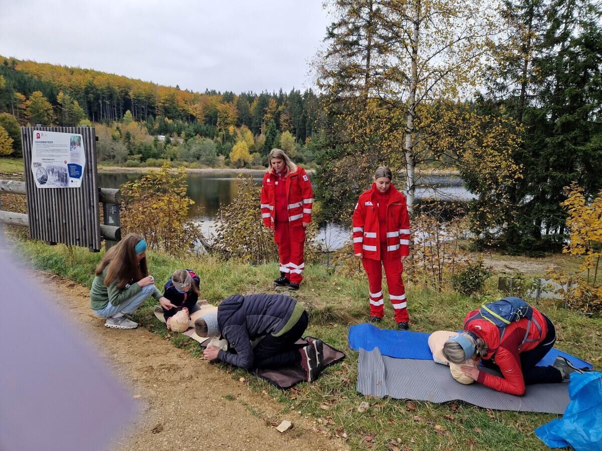 Vom Anlegen von Verbänden über das Absetzen eines Notrufs bis hin zur Wiederbelebung an einer Reanimationspuppe – überall wurde mit Begeisterung geübt. Unterstützt wurden die Wandernden dabei von engagierten Rettungssanitätern und Jugendrotkreuz-Kindern des Roten Kreuzes Liebenau, die mit Rat und Tat zur Seite standen. Auf dem weichen Moorboden, zwischen Bäumen, Wasser und mystischer Stille wurde Lernen zum Erlebnis.