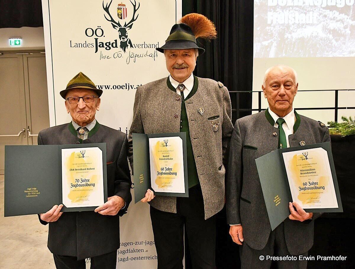 Die Ehrennadel für langjährige weidgerechte Jagdausübung erhielten: Rudolf Freudenthaler, Gutau – 60 Jahre; Johann Pichler, Hirschbach i. M. – 60 Jahre; Maximilian Brandstetter, Neumarkt i. M. – 60 Jahre; Karl Bauer, Stockerau – 60 Jahre; Horst Hametner, Bad Zell – 60 Jahre; Karl Fuchs, Neumarkt i. M. – 60 Jahre; Michael Weglehner, Neumarkt i. M. – 60 Jahre; Robert Bernhard, Unterweitersdorf – 70 Jahre