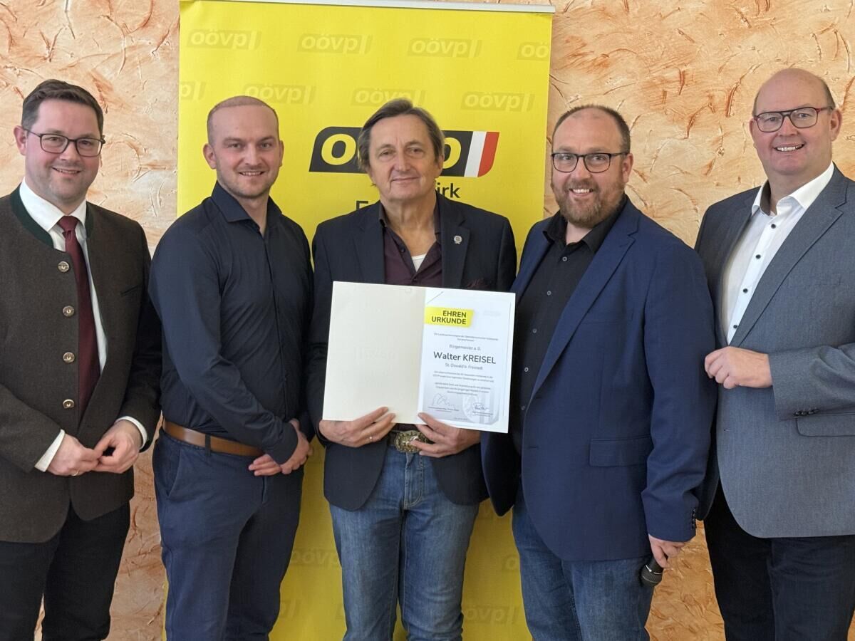 ST. OSWALD. Beim Gemeindeparteitag der OÖVP St.Oswald wurde Gemeinderat Klaus Pröll mit 100 Prozent Zustimmung zum Parteiobmann gewählt. OÖVP Landesparteisekretär Florian Hiegelsberger, Bezirksparteiobmann Josef Naderer und Bezirksgeschäftsführer Gerhard Mark gratulierten an der Spitze der mehr als 60 Gäste.