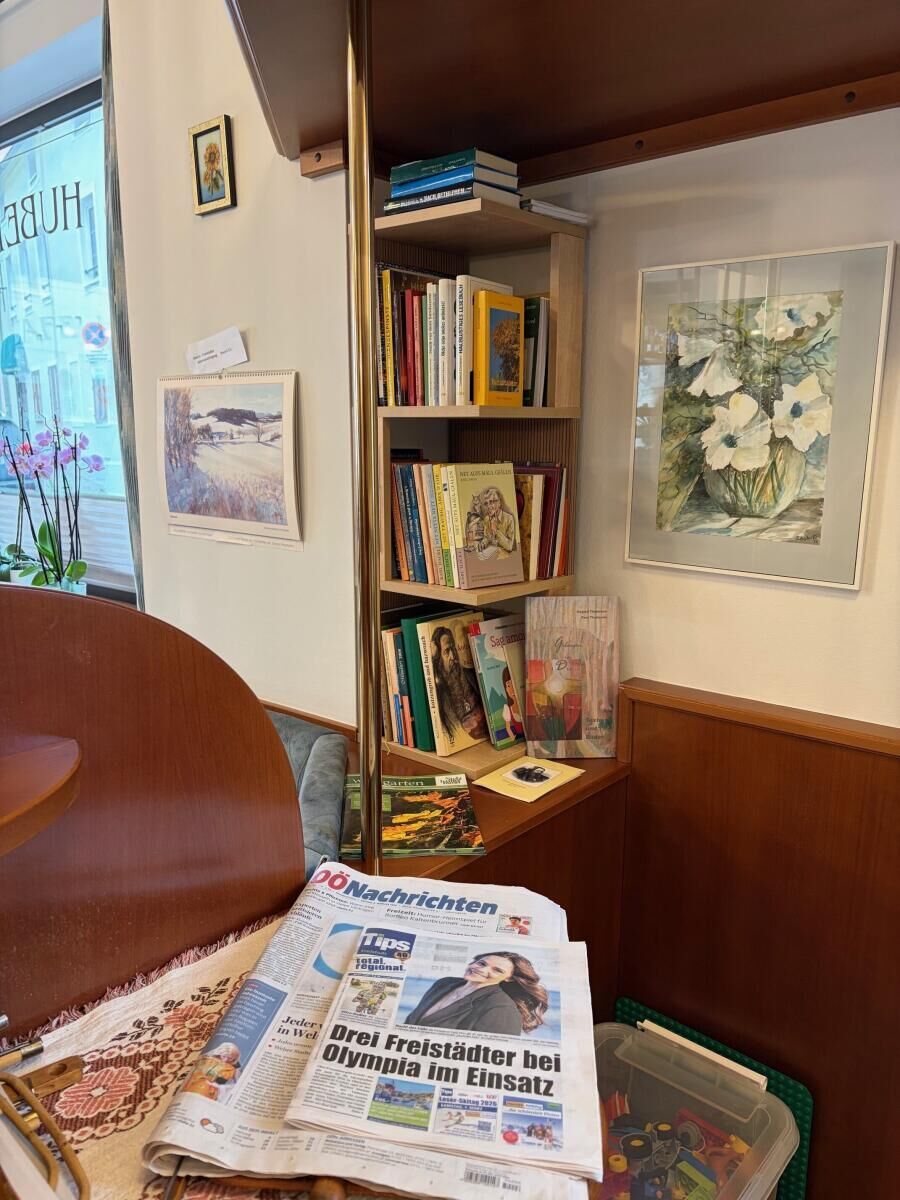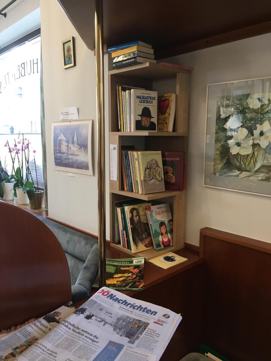 Mundartbücher im Café Hubertus zum Schmökern beim Kaffee