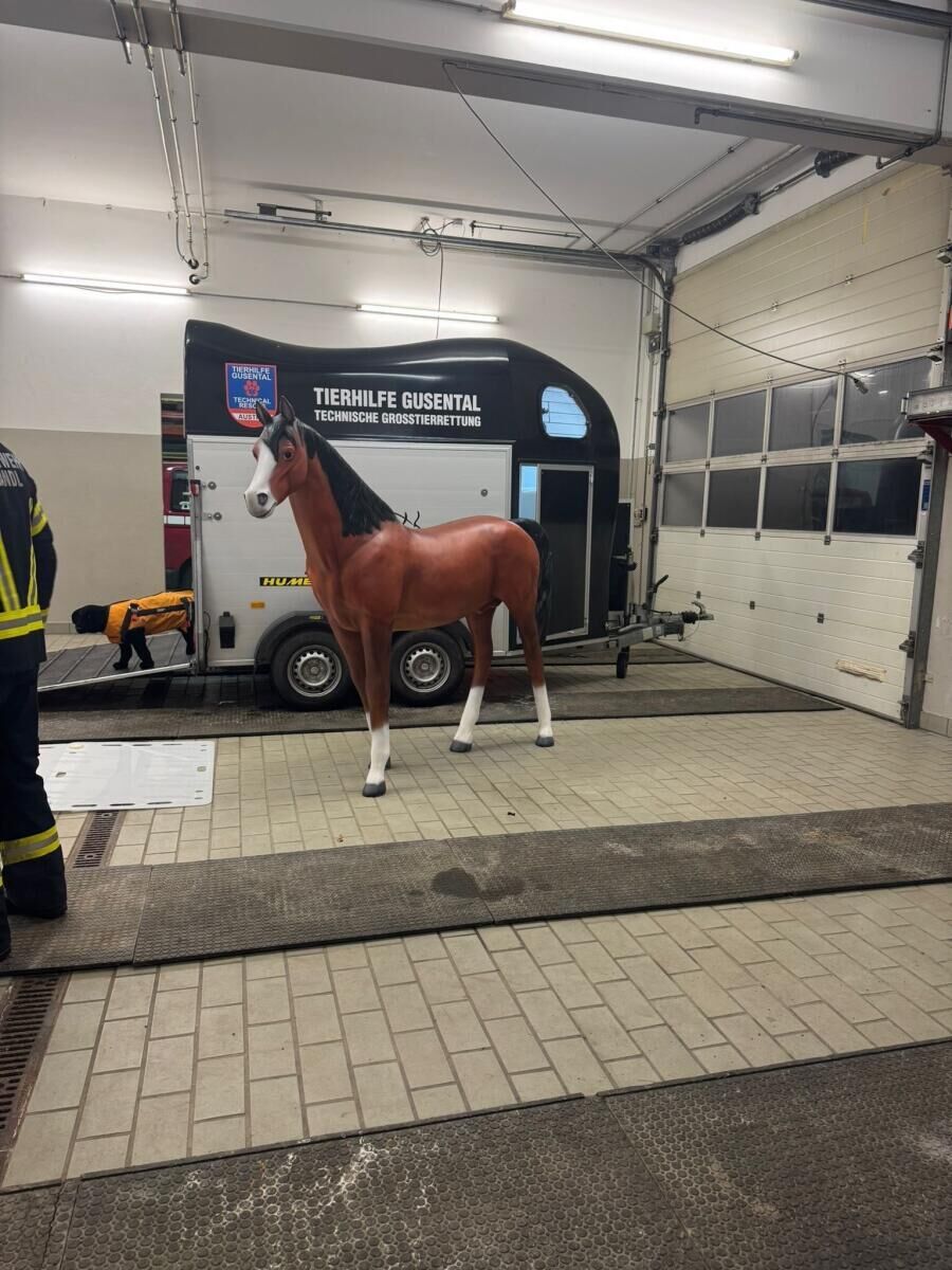 Im Anschluss wurde die vorhandene Ausrüstung begutachtet und näher kennengelernt. An dem Dummy-Pferd „Pferdinand“ wurde zudem das Anlegen eines Hebegeschirrs sowie eines Nothalfters demonstriert.