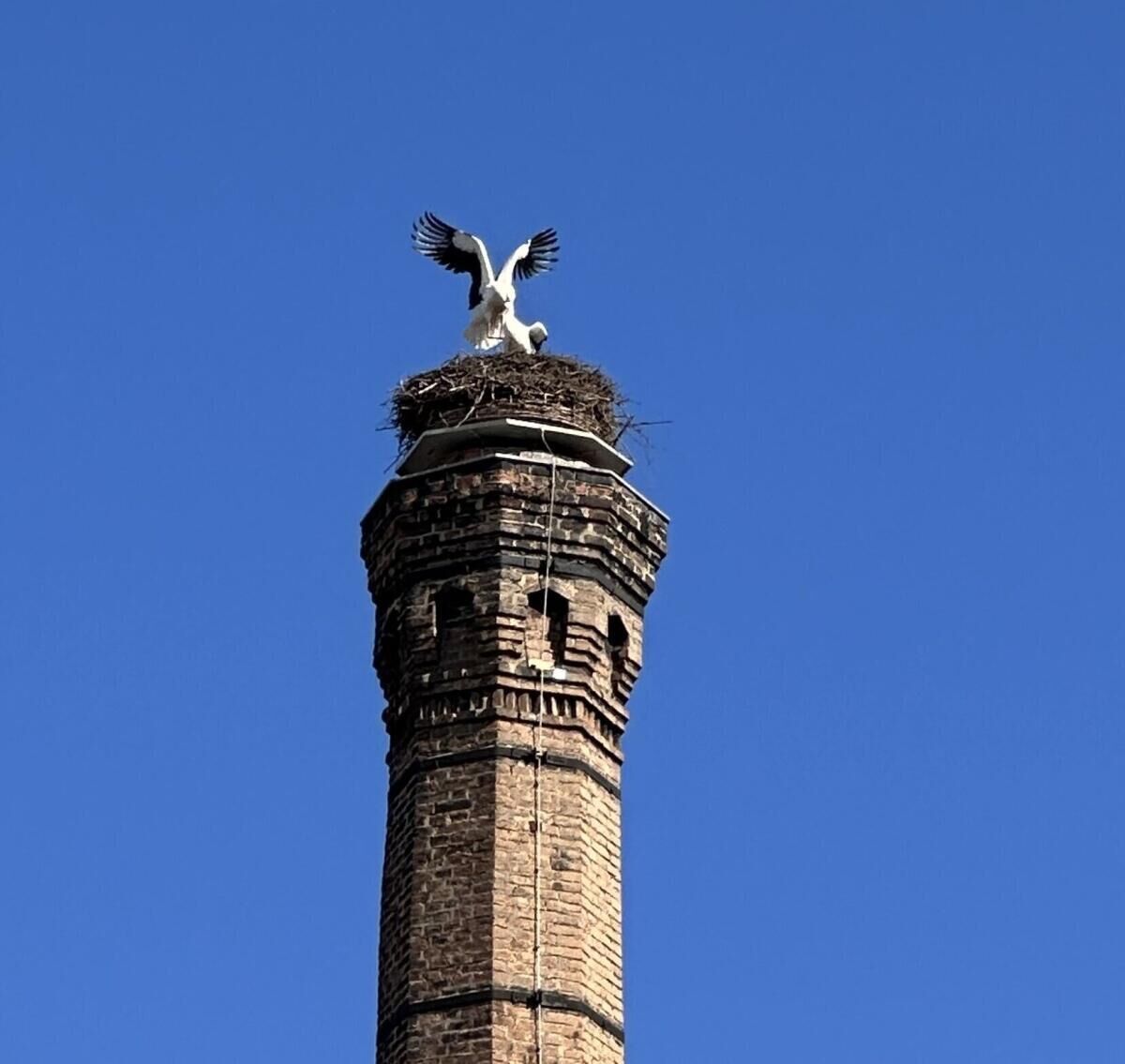 Die Störche sind aus ihrem Winterquartier zurückgekehrt und bessert seither eifrig das Nest in luftigen Höhen aus.