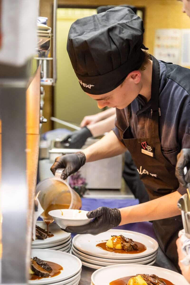 WARTBERG/BAD LEONFELDEN. Von der ersten Idee für das Menü bis zum Servieren: 20 Schüler der vierten Klassen der Tourismusschulen Bad Leonfelden übernahmen für einen Tag die Leitung des Wiaz`Haus Dinghofer in Wartberg.