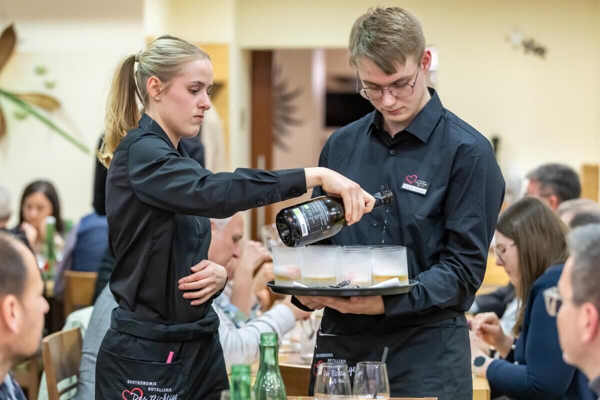 „Unsere Praktika haben uns bereits viele praktische Einblicke ermöglicht. Doch die Gesamtverantwortung für alle Abläufe zu tragen, ist noch einmal eine ganz andere Herausforderung“, sagt Schüler Tobias Roscher. „Wir haben uns auch viele Gedanken über die Tischdeko gemacht und die regionalen Lieferanten von Dinghofer mit einbezogen“, ergänzt Hannah Gierlinger.
