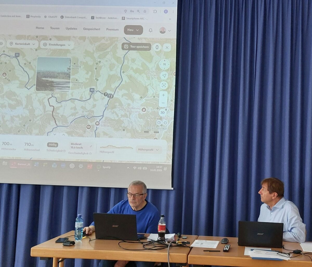 LASBERG. Mit der Komoot App lernten die Teilnehmer des Cafe Smarthphone eine beliebte Wander-, Bergsteig- und Radfahr App kennen - damit sie in Zukunft Wanderungen und Radfahrten gut planen können.