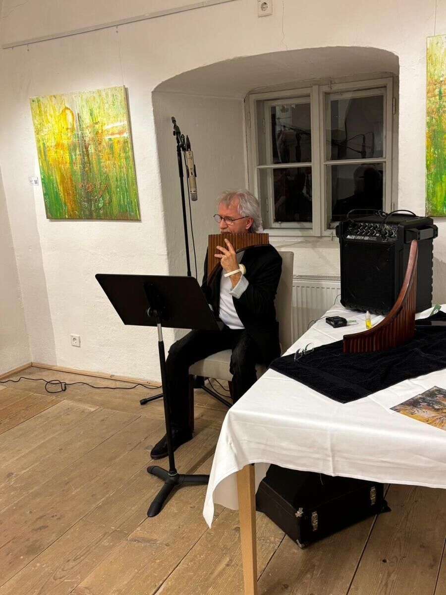 Wilhelm Bröselmeyr begleitete die Ausstellung mit seinen Panflötenklängen und sorgte für Gänsehaut und Herzflattern. Christoph Heumader moderierte und begeisterte mit einer Zusammenfassung des 35-jährigen Künstlerschaffen von Manuela Eibensteiner.