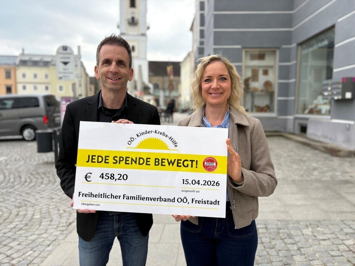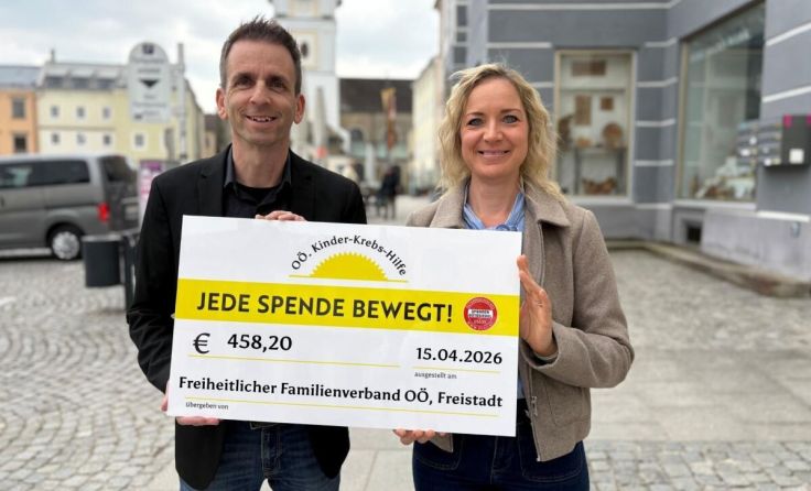 FREISTADT. In Vertretung des Freiheitlichen Familienverbandes Oberösterreich (FFV OÖ) hat Nationalratsabgeordneter Harald Schuh einen Spendenscheck in Höhe von 458,20 Euro an die OÖ Kinder-Krebs-Hilfe überreicht.