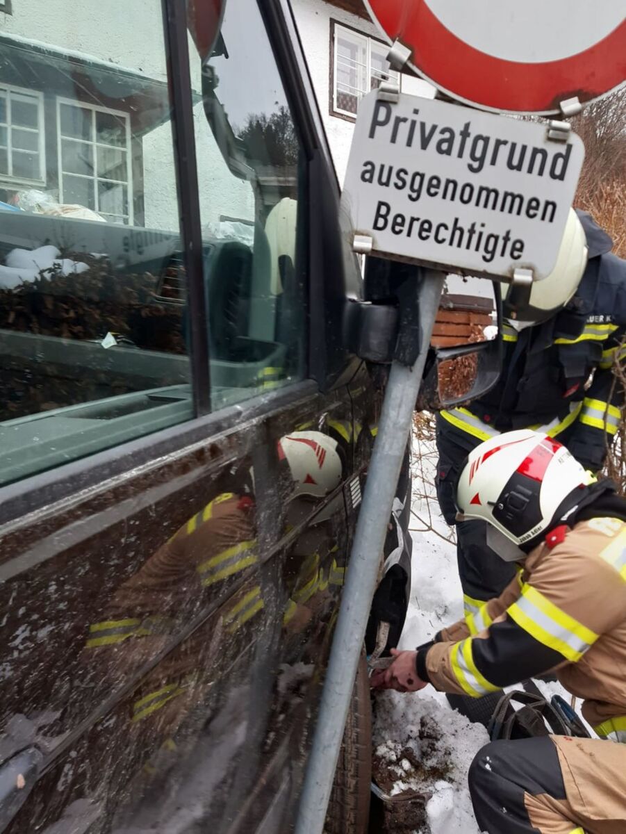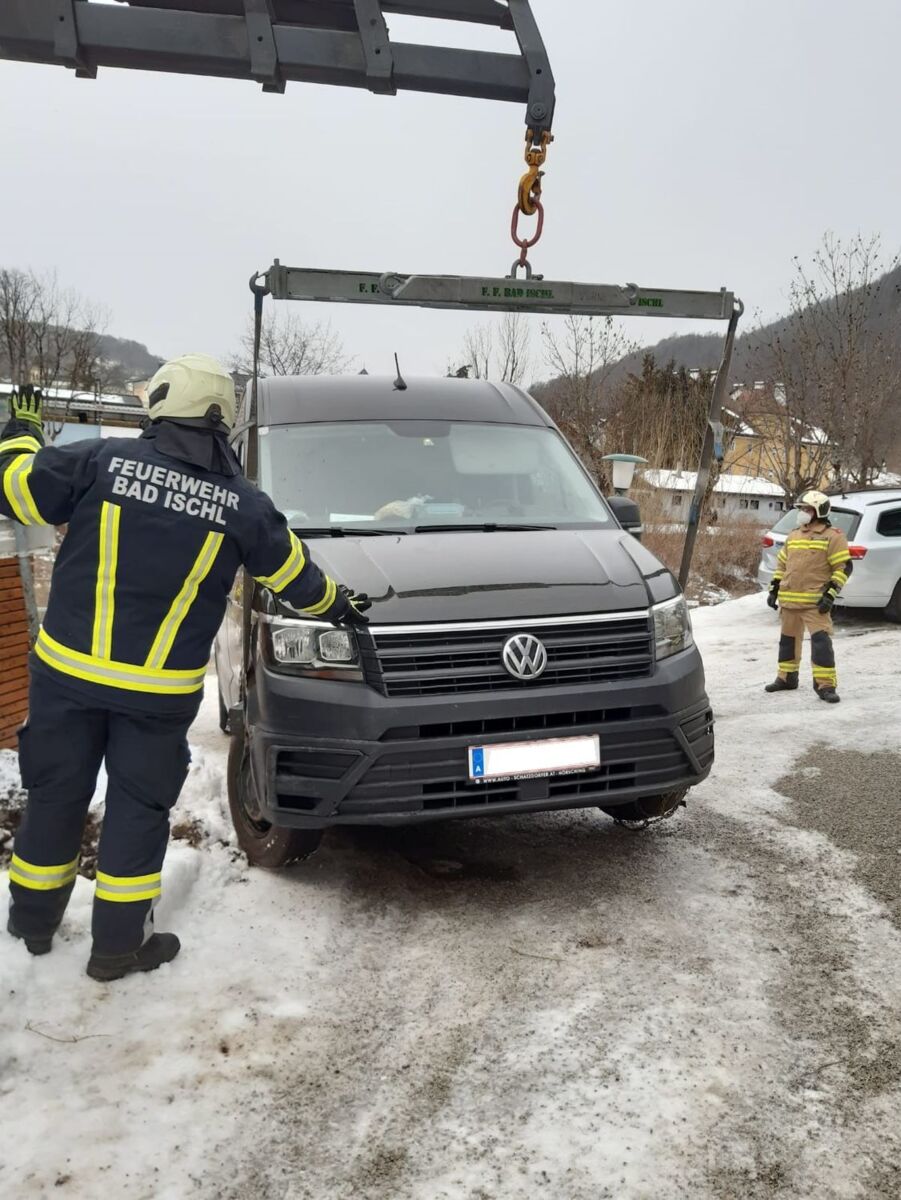 BAD ISCHL. Ein unglücklich verkeilter Kleinlastwagen beschäftigte am gestrigen Montag, 25. Jänner, die Feuerwache Rettenbach – Steinfeld – Hinterstein sowie der FF Bad Ischl. Ein Fahrer eines Botendienstes war mit seinem Fahrzeug auf einer steilen und abschüssigen Zufahrt gegen ein Verkehrsschild gerutscht und musste mittels Hebekreuz und Kran befreit werden.