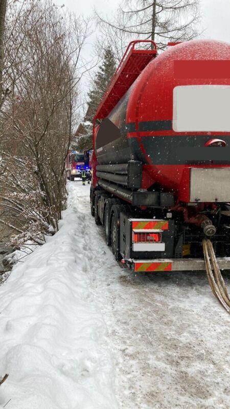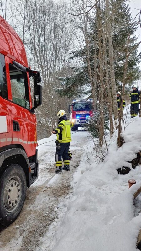 Der Pellets-Lkw war von der Altmannstraße neben dem Bach abgekommen und hatte sich festgefahren, Gemeindebedienstete riefen die Feuerwehr. Diese zog den Lastwagen mit der Seilwinde zurück auf die Straße. Nach rund zwei Stunden war der Einsatz beendet.