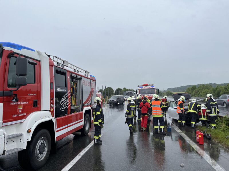 In Fahrtrichtung Salzburg waren zwischen Laakirchen West und Regau Montagnachmittag ein Kleintransporter und ein E-Fahrzeug in einen Unfall verwickelt. Dabei wurde der Lenker des E-Autos schwer verletzt. Die Erstalarmmeldung an die Feuerwehren enthielt die Informationen „Person eingeklemmt“ und „Fahrzeugbrand“, was sich glücklicherweise nicht bewahrheitete. Der schwerverletzte Fahrer wurde nach der Erstversorgung am Unfallort mit dem Notarzthubschrauber ins Krankenhaus geflogen.