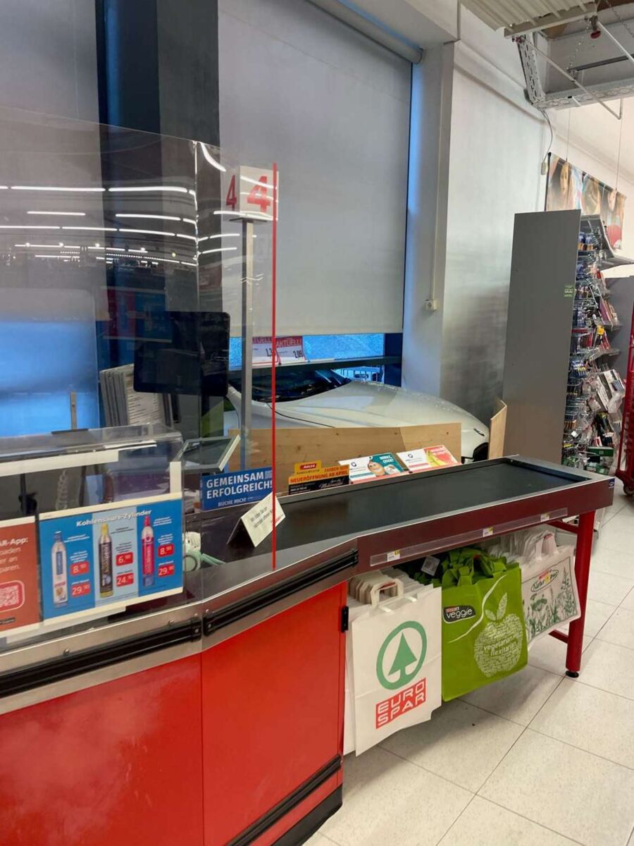 Eine 66-Jährige krachte am Parkplatz vor dem Geschäft aus noch ungeklärter Ursache gegen das Heck eines abgestellten Pkw. Dadurch wurde das geparkte Auto durch die Glasfassade des Lebensmittelmarktes geschoben und kam mit der Motorhaube im Inneren des Gebäudes zum Stehen. Dort befanden sich zu diesem Zeitpunkt im Kassenbereich mehrere Personen. Durch die umgefallenen Warenständer verletzte sich eine 69-Jährige leicht.