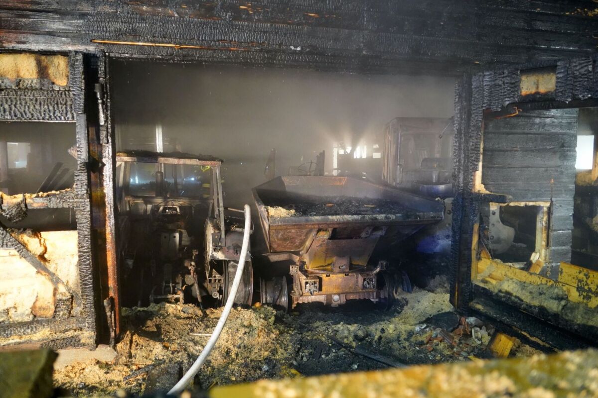 Durch die rasche Wasserversorgung aus einem angrenzenden Bach habe das Übergreifen der Flammen auf benachbarte Objekte verhindert werden können. Die drei in der Halle abgestellten Maschinen, darunter ein Bagger sowie ein Traktor, wurden durch die Flammen zerstört.