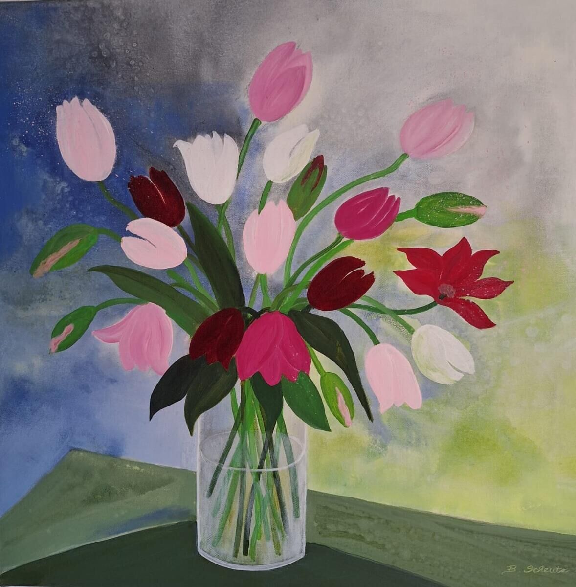 Brigitte Scheutz begann ihre künstlerische Tätigkeit nach langjähriger Arbeit als Dekorateurin. Sie beschreibt ihr Ziel so: „Mein Ziel ist es, kreative und farblich harmonierende Bilder zu malen. Vieles entdecke ich in der Natur. Einiges finde ich in meinen Bildern verändert oder ähnlich wieder.“ Neben Acrylfarbe verwendet sie auch strukturgebende Materialien wie Holzasche, Sand und Kaffeesatz. In ihren Arbeiten kommen auch Pflanzen und Papier in Mischtechniken zum Einsatz.