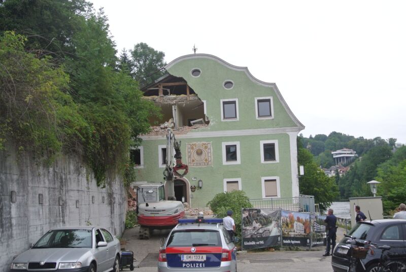GMUNDEN. Die Diskussion rund um die „Kösslmühle“ an der Traun ist um eine Facette reicher: Bei Arbeiten an dem markanten Gebäude, an dessen Stelle die Eigentümer einen – heftig diskutierten – Neubau errichten wollen, wurde ein Teil der Giebelwand entfernt.