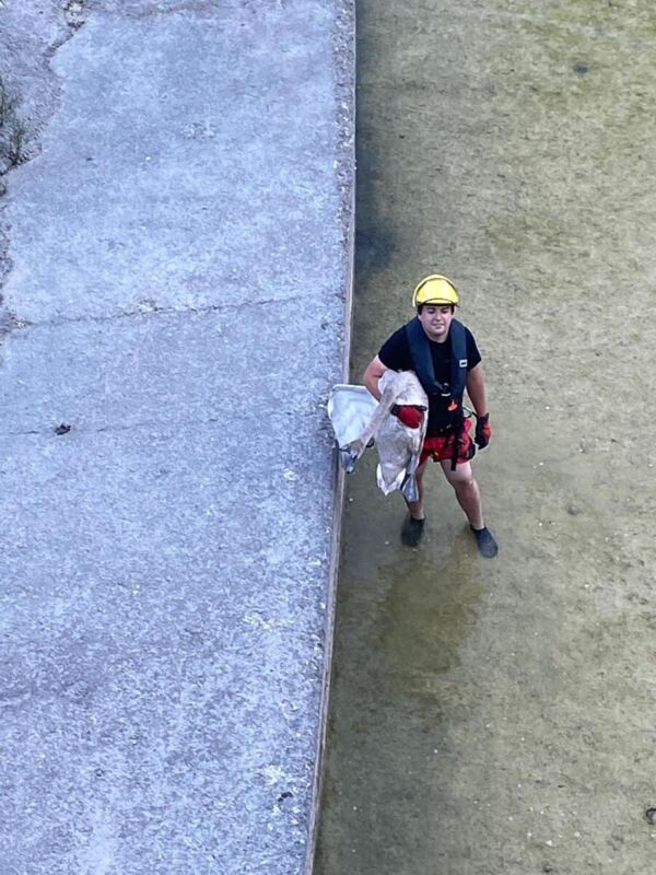 Vor Ort bestätigte sich die Meldung. Der Schwan am Ufer konnte rasch gesichert werden. Die Sicherung des Jungschwans erwies sich aber als etwas schwieriger, da er in zirka 20 Meter Tiefe war. Ein Mitglied der HAAR-Einheit (High Altitude Animal Rescue) seilte sich nach Freigabe der Warte der Energie AG zum Tier ab und sicherte es. Mit einem Seil wurde der Schwan anschließend nach oben gehoben. Dem allen noch nicht genug, schwammen auf zirka 750 Meter verteilt oberhalb der Staumauer zwei weitere Jungschwäne. Da die Tiere noch zu jung sind, um alleine zu überleben, wurden auch diese Tiere gesichert. Alle vier Schwäne befinden sich aktuell im Tierheim Freistadt und werden dort versorgt.
