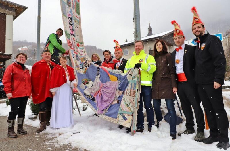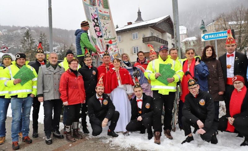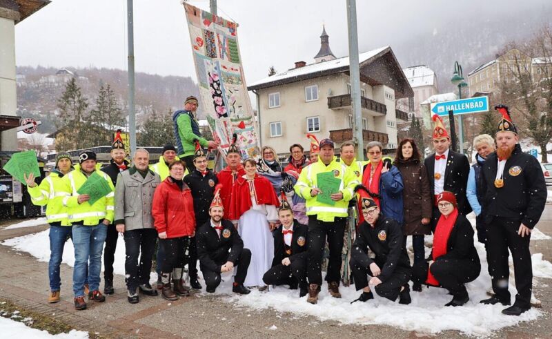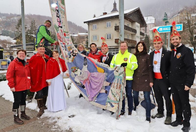 Auch heuer hisste Bürgermeisterin Sabine Promberger, unterstützt von ihrer Amtskollegin Ines Mirlacher aus Ohlsdorf, dem Ebenseer Faschingsprinzenpaar und Vertretern des Ebenseer Faschingsvereines, die große Fetzenfahne vor dem Rathaus. Dazu kommen viele weitere bunte Fahnen, die bereits von den Wohnhäusern wehen – bis zum Faschingswochenende werden noch einige dazukommen. Darüber hinaus sind an allen Ecken der Salinengemeinde bereits original gekleidete Fetzenpuppen aufgestellt. Auch die Brücken des Ortes sind mit bunten Stoffgirlanden geschmückt. Es ist offensichtlich: Die coronabedingte Zurückhaltung beim Faschingfeiern hat ein Ende.