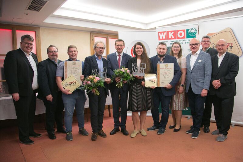 Der „Wirt am Bach“ in Oberweis in Laakirchen ist neben dem Gasthaus „Zum Onke Heli“ (Kirchberg bei Mattighofen) der beste KultiWirt 2023 in Oberösterreich. Beide Gastronomiebetriebe haben sich mit ihrer punktegleichen Bewertung die begehrte Trophäe gesichert. „Eine Premiere in der zehnjährigen Geschichte dieses Wettbewerbs um die Besten in den Reihen der größten oberösterreichischen Wirtekooperation“, freute sich KultiWirte-Obmann Karl Wögerer, der gemeinsam mit Wirtschafts- und Tourismuslandesrat Markus Achleitner und anderen Wirtschaftskammer-Vertretern die diesjährigen KultiWirte des Jahres gebührend ins Rampenlicht rückte.