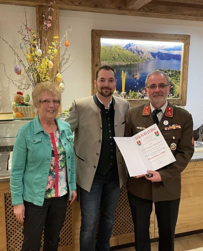 Johannes Briganser wurde zum Ehren-Hauptbrandinspektor ernannt, im Anschluss folgten Reden der Ehrengäste für das neue aber auch alte Kommando und viel Dank für den scheidenden Kommandanten Johannes Briganser. Von seiten der Gemeinde wurden seine Verdienste mit der Ehrennadel in Gold gewürdigt.