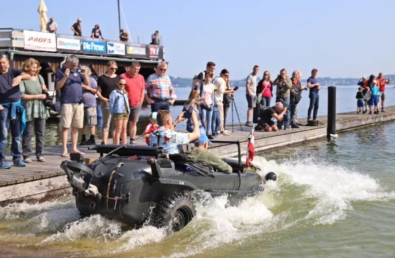 Drei Tage lang nutzten zahlreiche Schaulustige die Gelegenheit, die raren, zivilen und militärischen Schwimmwagen zu Wasser und zu Land zu bestaunen. Ein umfangreiches Rahmenprogramm ergänzte das Schwimmwagentreffen 2023 am Lacus Felix.