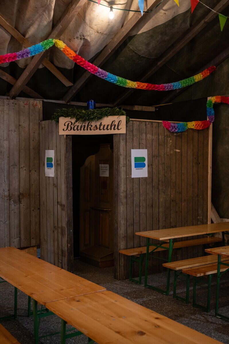Die Freunde leben beim Pfingstfest ihre Kreativität aus: „Wir haben in Ebensee das Problem, dass man ab 12 Uhr nur noch schwierig Geld bekommt, deshalb hatten wir die Idee zu einem Bankstuhl“, lacht der Ebenseer. Dabei handelt es sich um einen alten Beichtstuhl, ebenfalls über Willhaben gekauft. „So kann man jederzeit Geld abheben, ohne das Bierzelt zu verlassen“. Hinter dem Vorhang des Bankstuhls sitzt ein Kassier der Feuerwehr und zahlt den Leuten das gewünschte Geld aus. Pfatschbacher erzählt von einer weiteren Besonderheit des Bierzelteigenen Bankomaten: Geht eine Person hinein, so schaltet sich ein Blaulicht ein. „Die Ebenseer sind sehr neugierig. Mit dem Blaulicht kann jeder sehen, wer in den Bankstuhl hineingeht“, lacht er.