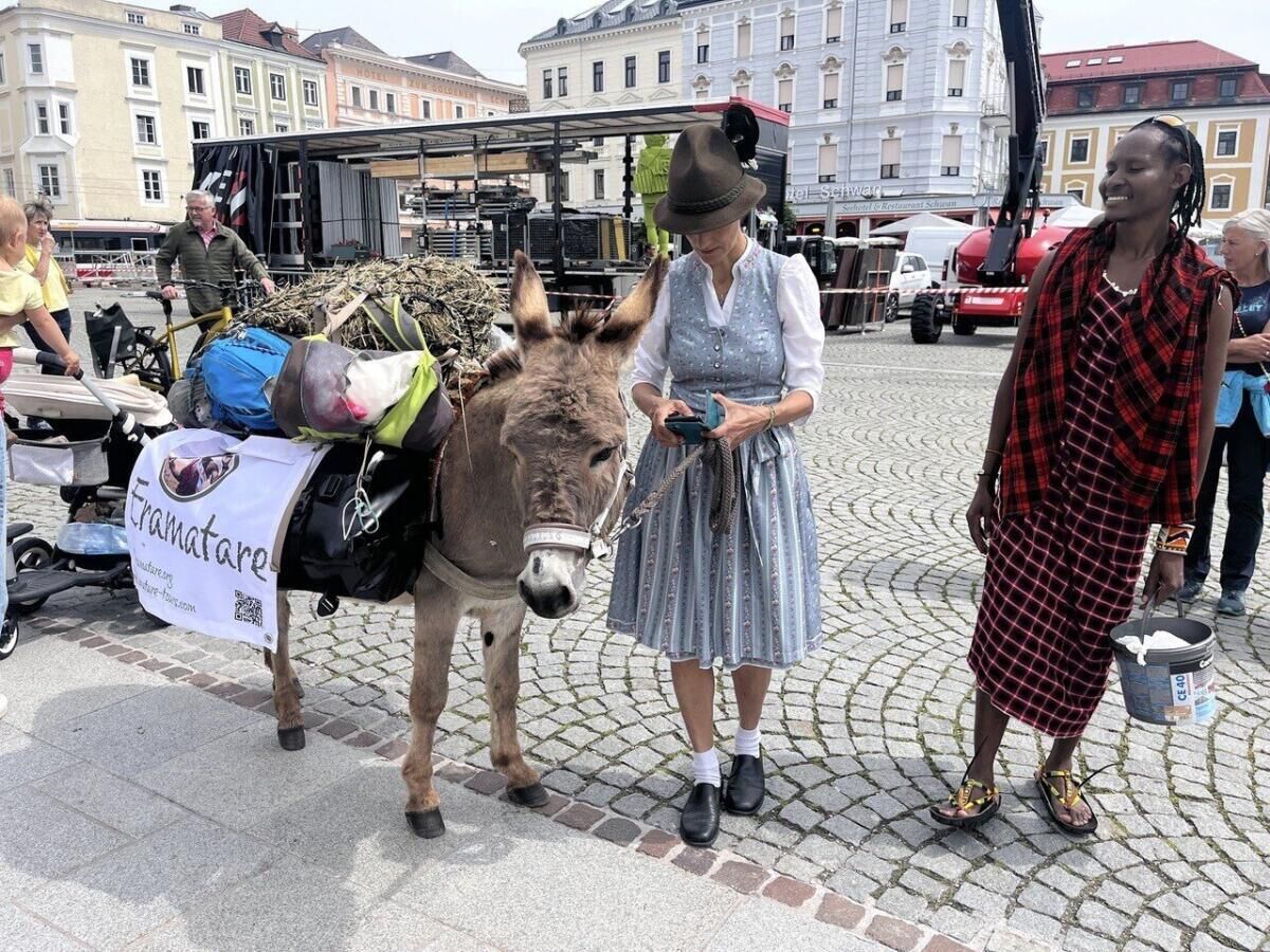 GMUNDEN. „Wenn viele kleine Leute etwas tun, ist viel Großes im Kleinen möglich.“ Sigrid Sadjak aus Aldrans wandert mit dem Esel Pauli von Gmunden nach Innsbruck, um Spenden für den Aufbau einer Schule in Tansania zu sammeln.