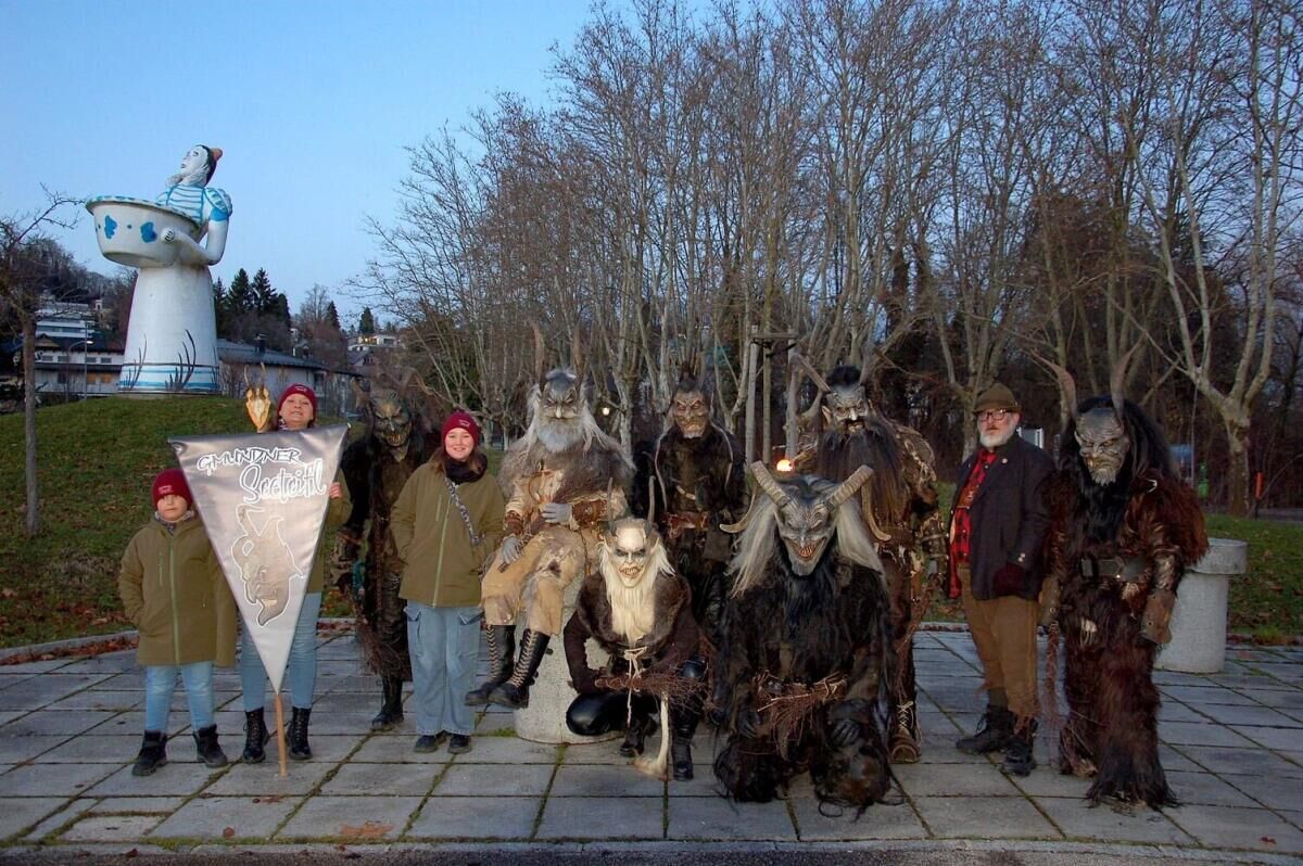 Am Krampustag war für die Krampuspass „Gmundner Seeteifl“ ein ereignisreicher Tag in der Bezirksstadt Gmunden. Vom Toskanaparkplatz aus startete die Gruppe ihr traditionelles Treiben. Die Route führte entlang der Esplanade, durch den Graben, über den Marktplatz und die Traunbrücke bis hin zum Klosterplatz.