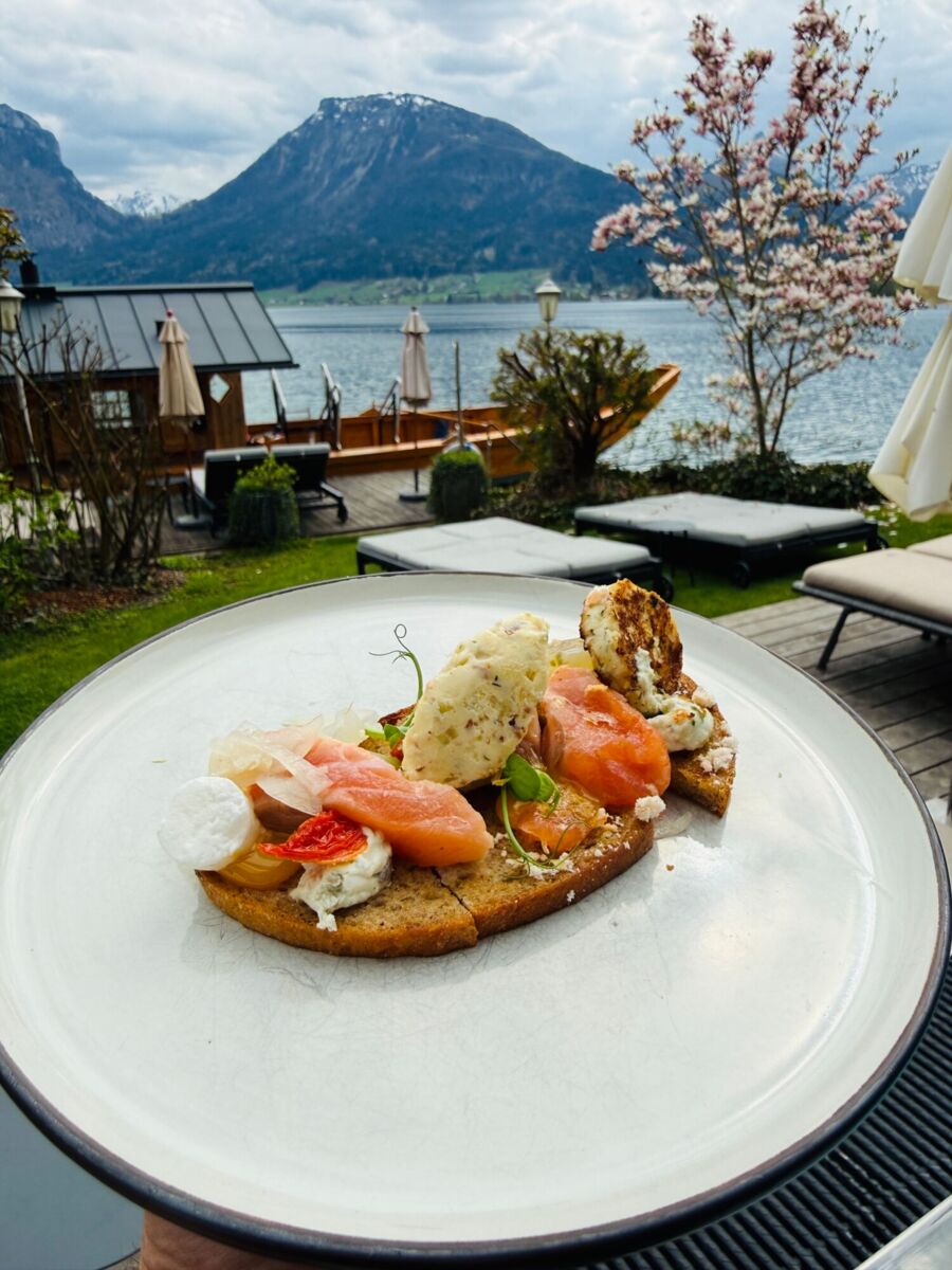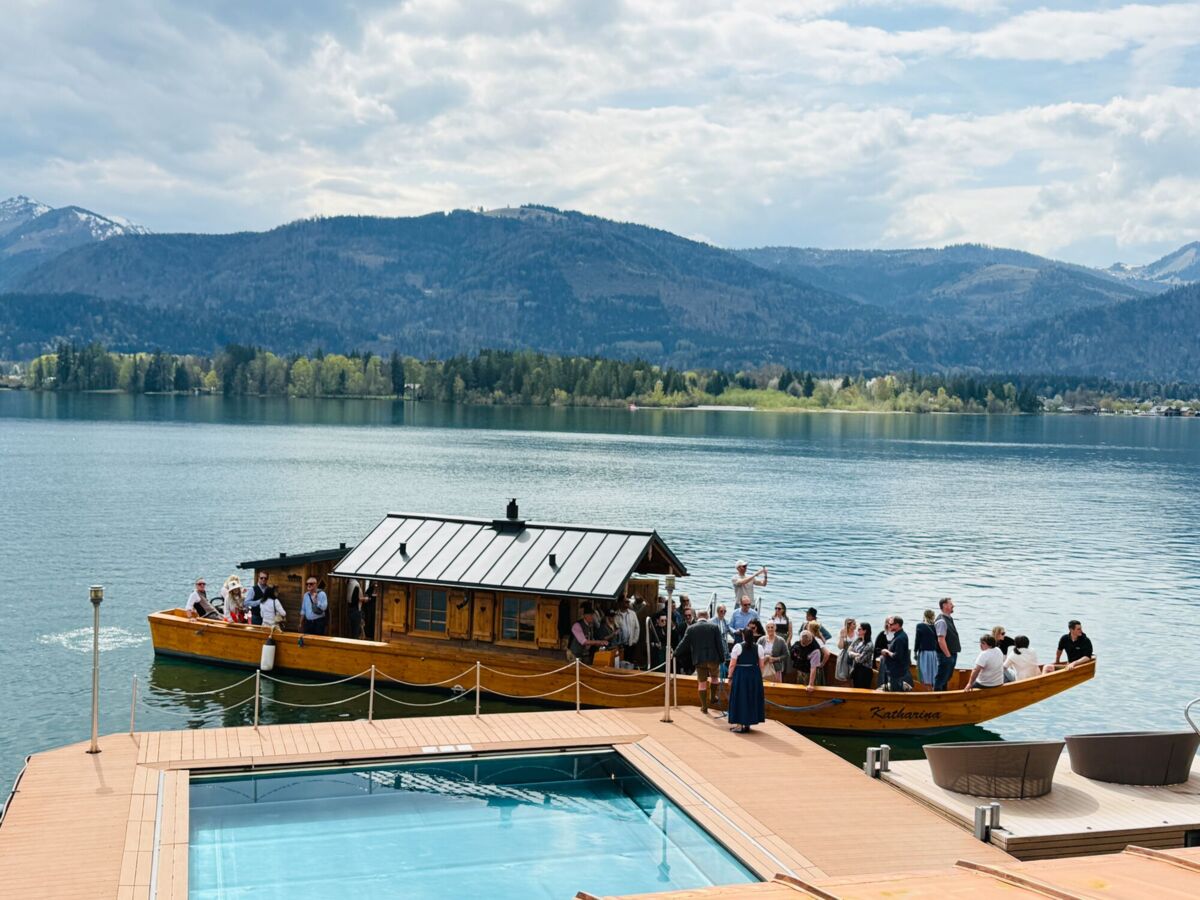 Der Auftakt erfolgte in der Seevilla Wolfgangsee bei Gastgeberin Franziska Gastberger mit einer Fischbrettl-Jause. Danach ging es per Erlebnis-Traunerl von Sigi Falkensteiner über den Wolfgangsee weiter zum Romantik Hotel Im Weissen Rössl, dort wartete bereits Rösslwirtin Gudrun Peter höchstpersönlich und empfing die Gäste persönlich am Steg.