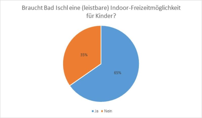 Von knapp 500 abgegeben Stimmen antworteten 65 Prozent mit JA, dass Bad Ischl eine (leistbare) Indoor-Freizeitmöglichkeit für Kinder braucht. 35 Prozent empfinden das Angebot offenbar für ausreichend und stimmten mit NEIN. Somit ist das Ergebnis der Umfrage eindeutig: Der Bedarf nach einer Indoor-Freizeitmöglichkeit ist gegeben.
