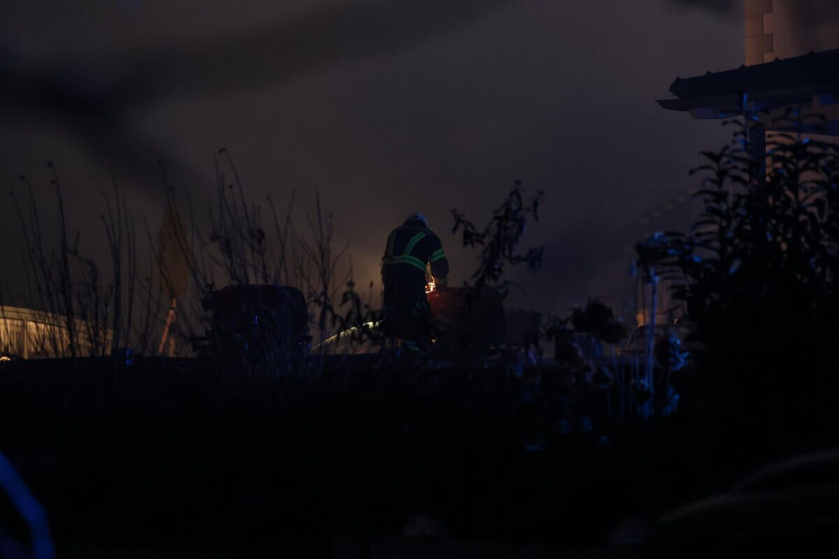 Die Feuerwehr rief dann umgehend Alarmstufe 3 aus, woraufhin Kräfte von 13 Feuerwehren am Einsatzort im Löscheinsatz standen. Die Platzverhältnisse am Einsatzort waren beengt, zahlreiche anrückende Fahrzeuge reihten sich aneinander, schwierig war auch die Wasserversorgung.