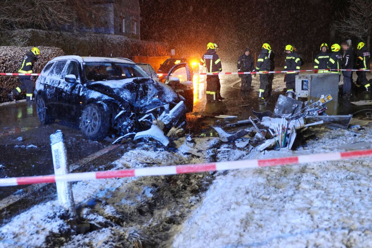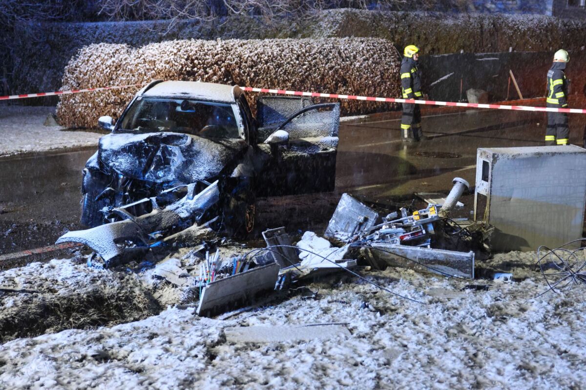 Auto prallt im Schneetreiben gegen Schalt- und Verteilerschränke in Waizenkirchen