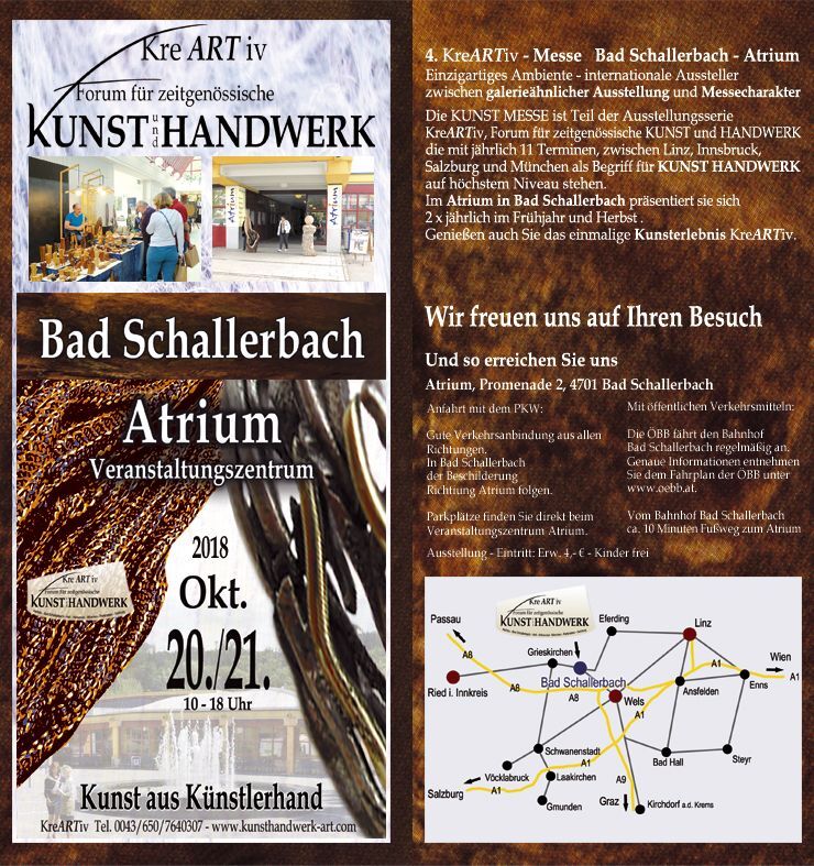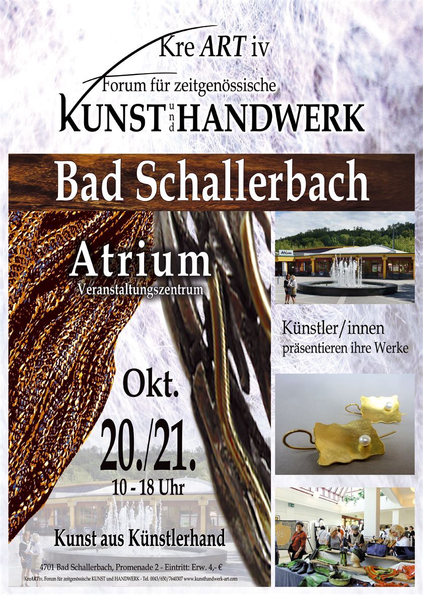 BAD SCHALLERBACH. Das Atrium in Bad Schallerbach wird am 20. und 21. Oktober, jeweils von 10 bis 18 Uhr, wieder zum Treffpunkt für tausende Kunstliebhaber und Freunde des hochwertigen Kunsthandwerks.