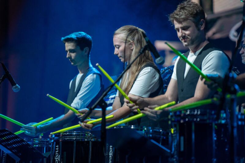 Neben dem Kompositionen konnten die Besucher eine visuelle Reise durch unser Bundesland antreten. Die kurzweiligen Videos mit Moderatorin Sabine Petzl waren ganz auf die Kompositionen zugeschnitten. Reisebegleiter war die SnareForce-Oö. Drumline des Oö. Landesmusikschulwerkes.