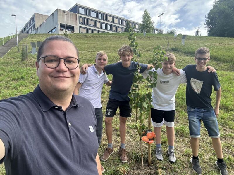Im Rahmen eines Klimaschutzprojektes haben Aron, David, Adrian und Daniel aus der 6B des Borg Grieskirchen gemeinsam mit dem Sozial- und Generationenstadtrat Thomas Antlinger die drei Obstbäume beim Schulzentrum gepflanzt.