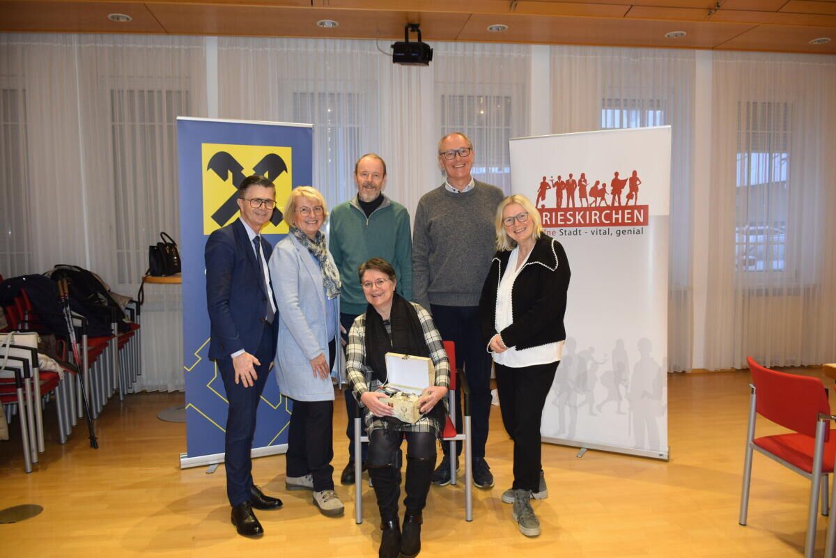 Bei der Übergabe der Schatztruhe mit den Trattnachtalern gratulierten Bürgermeisterin Maria Pachner, Stadtrat und Stadtmarketing-Obmann Thomas Wimleitner, Erwin Schützeneder (Leiter der Raiffeisenbank Grieskirchen) sowie Stadtmarketing-Geschäftsführerin Lilli Brauneis der glücklichen Gewinnerin.