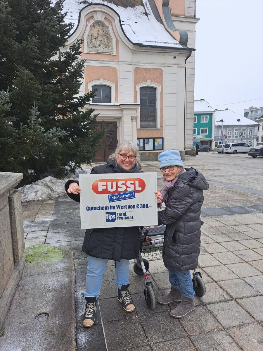 Monika Pointner aus Wendling war mit ihrer Klientin von der mobilen Betreuung in Grieskirchen unterwegs. Am Kirchenplatz wurde sie plötzlich mit der Frage nach ihrer Lieblingszeitung konfrontiert. Die Antwort kam wie aus der Pistole geschossen: „Ja, die Tips“. Bei der Überreichung des 300-Euro-Gutscheins der Fussl Modestraße durch die Tips-Glücksengerl Katharina Bocksleitner konnte sie ihr Glück kaum fassen. Die Tips lese sie regelmäßig, um zu erfahren, was in der Region so los ist. Mit ihrem Gewinn wird Pointner gemeinsam mit ihrer Klientin einmal einen Shopping-Tag einlegen.