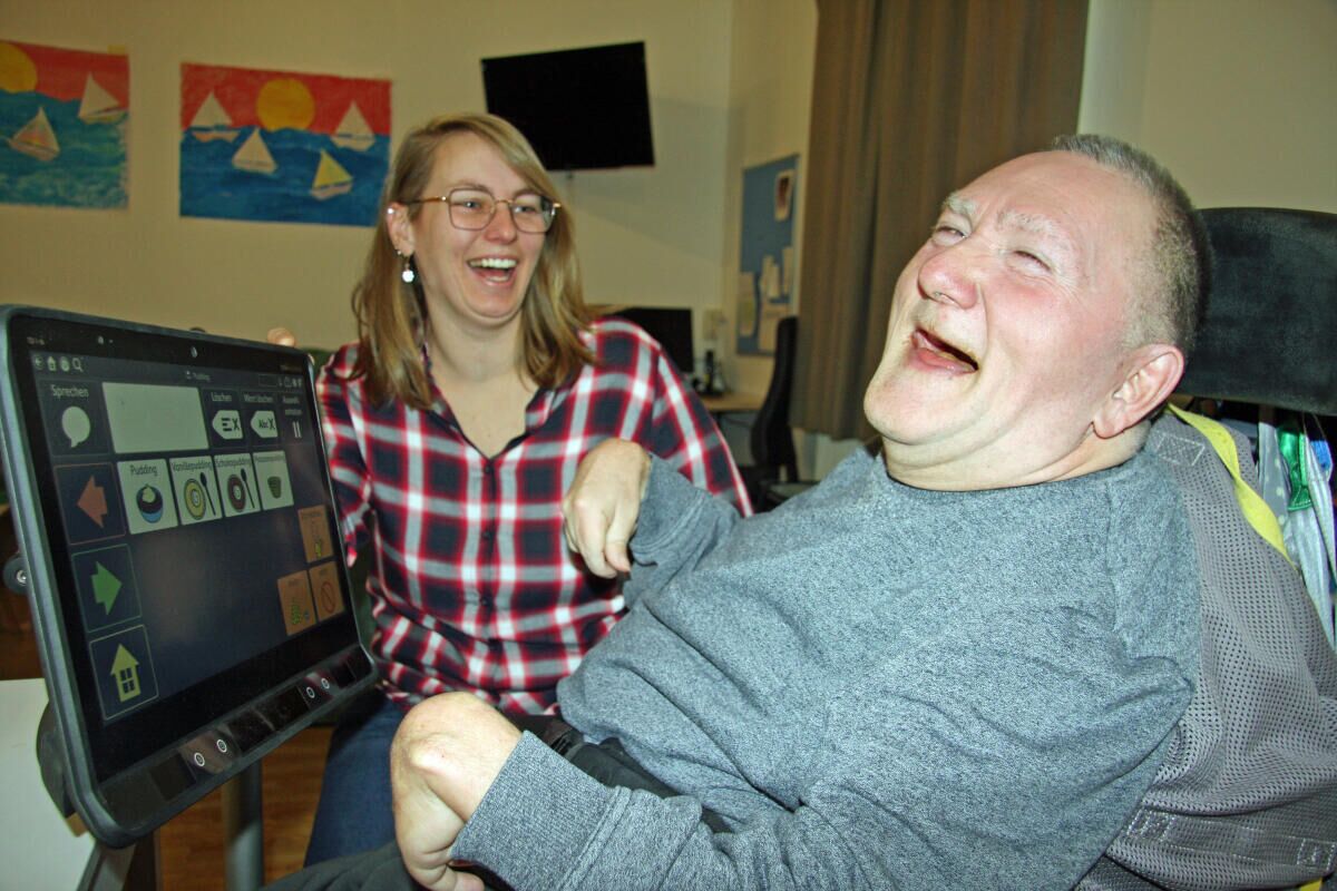 Heute verwenden mehrere Bewohner individuell angepasste Kommunikationshilfen, die per Fingertipp oder sogar durch Augenbewegungen gesteuert werden. Dabei stehen ihnen verschiedene Symbole zur Verfügung, die für einzelne Worte, Fragen, Wünsche oder auch Lieblingsspeisen stehen können.