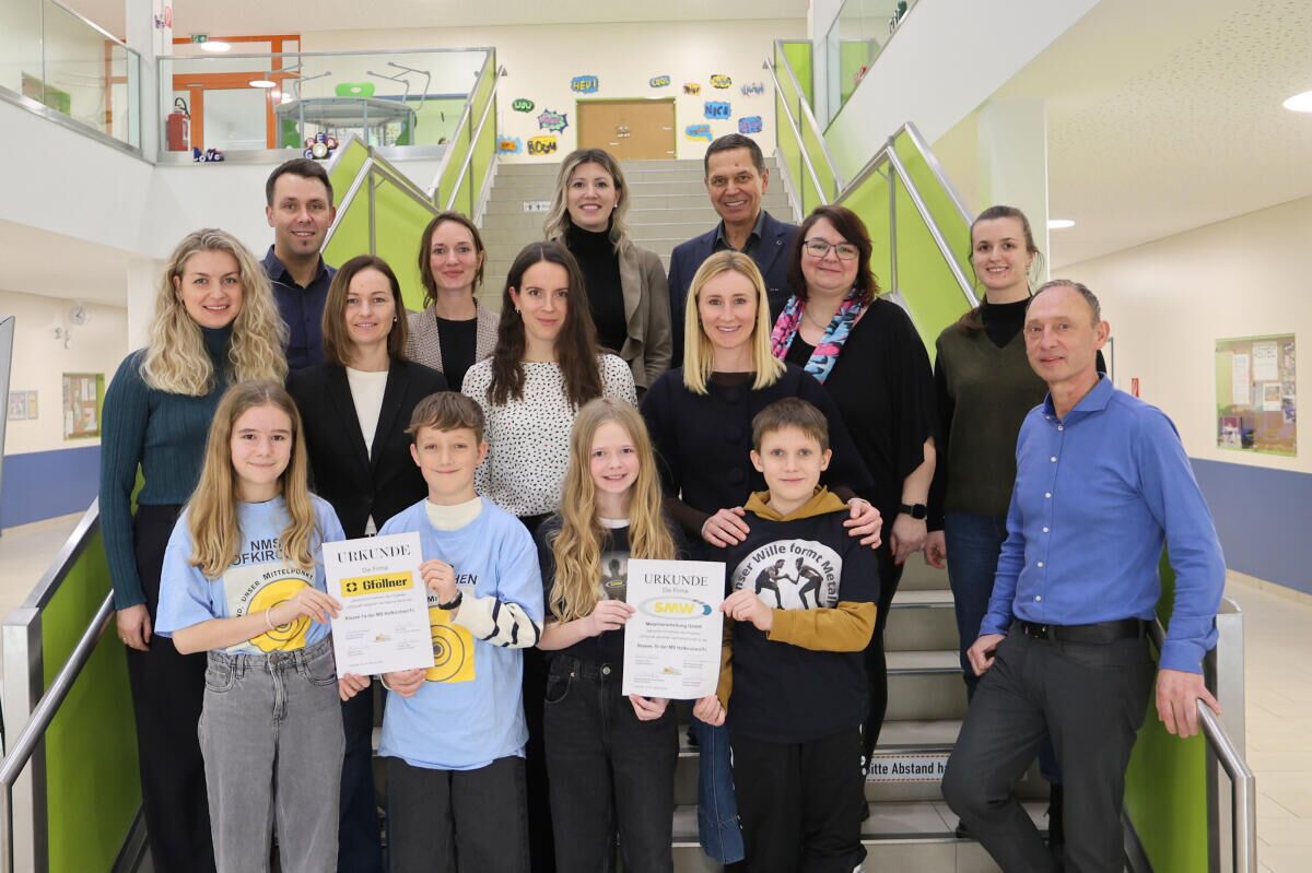 Dabei wurden die Patenschaftsurkunden und die Sponsorenverträge unterzeichnet. Die Firma Gföllner Fahrzeugbau und Containertechnik ist Pate der 1a-Klasse, die Firma SMW Metallverarbeitung ist Pate der 1b-Klasse. Vertreten waren unter anderem Anna Rab von der Firma Gföllner, Manfred Müthringer, Geschäftsführer von SMW, Schulleiterin Linda Schneider, Bürgermeister Josef Gadermeier, Hans Moser, Leiter der WKO Grieskirchen, Klassenelternvertreter sowie die Klassensprecher.